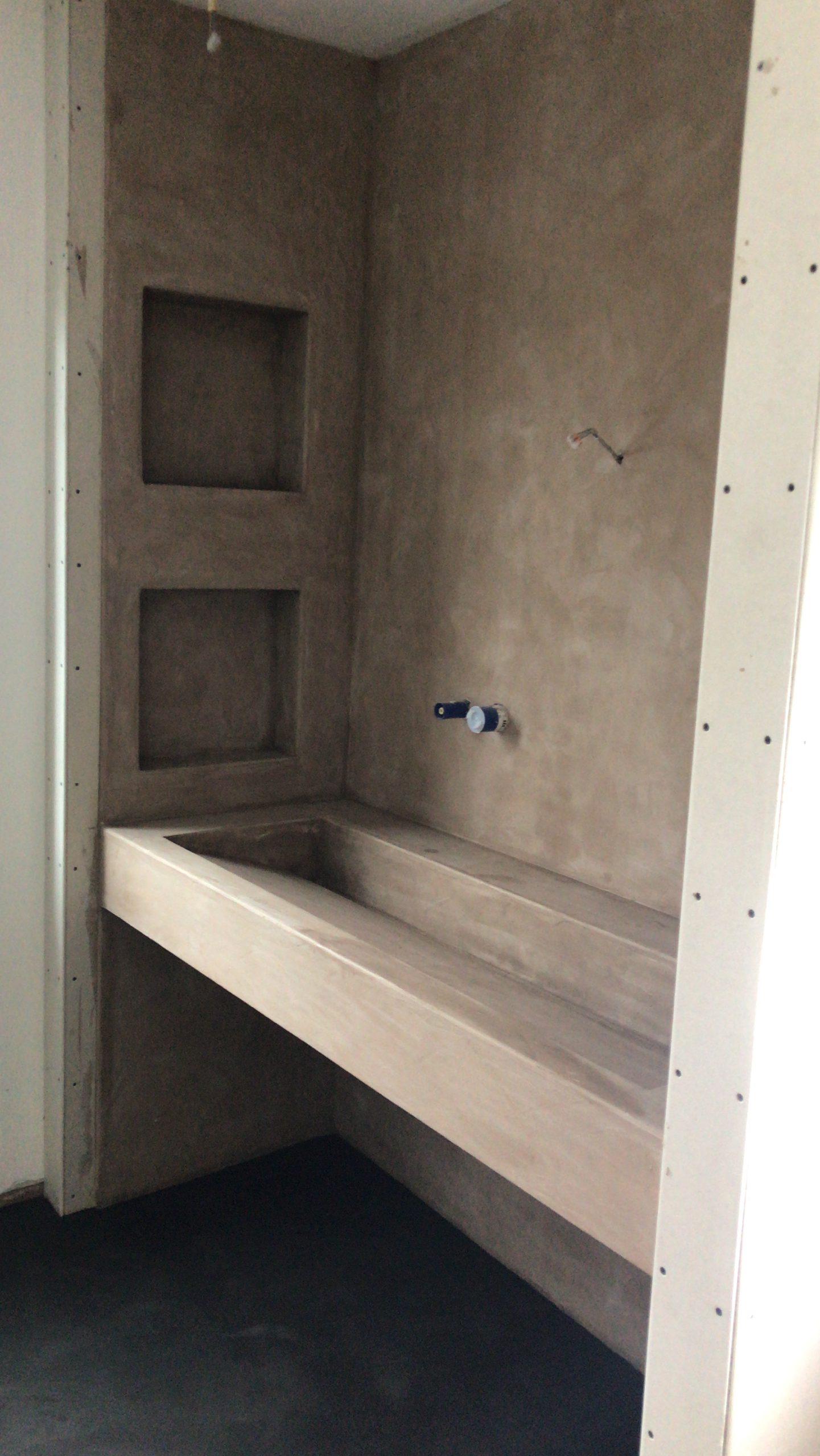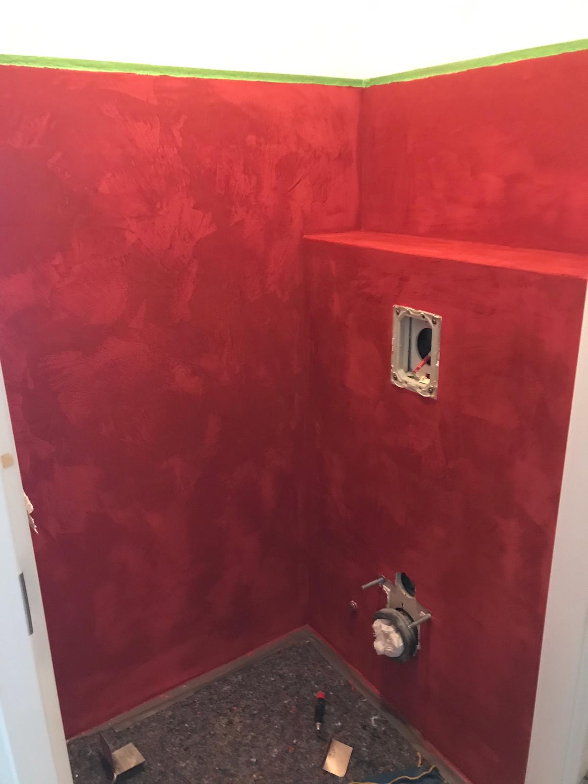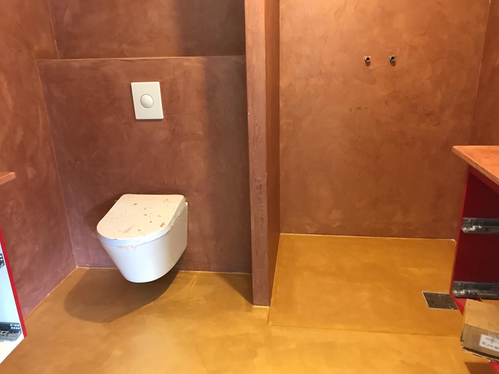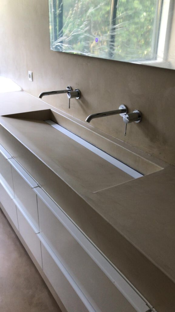 Net als natuursteen heeft marmorino floor een open structuur en moet tegen indringend vuil en vocht beschermd worden. Hiervoor gebruiken we professionele sealers die het oppervlak van een ondoordingbare laag voorzien. In de zogenaamde natte cel van de badkamer worden er 3 lagen sealer aangebracht om het indringende vocht te weren. Na het aanbrengen is niet direct te zien of de sealer overal afdoende is. De wand zal op de plekken waar er toch nog vocht in het stuc trekt donker verkleuren. Dit vocht zal na drogen verdwijnen waarna de wand weer in de oorspronkelijke kleur opdroogt. Na droging moeten de verkleurende plekken van een extra seallaag voorzien worden.